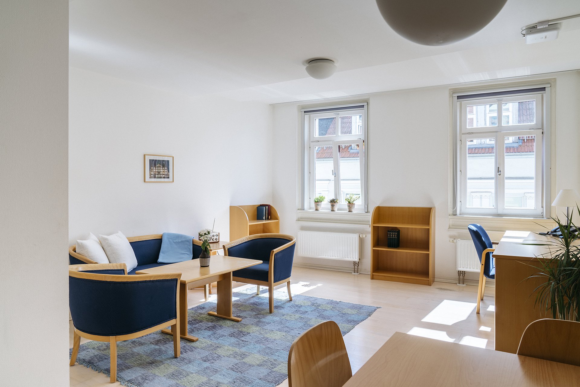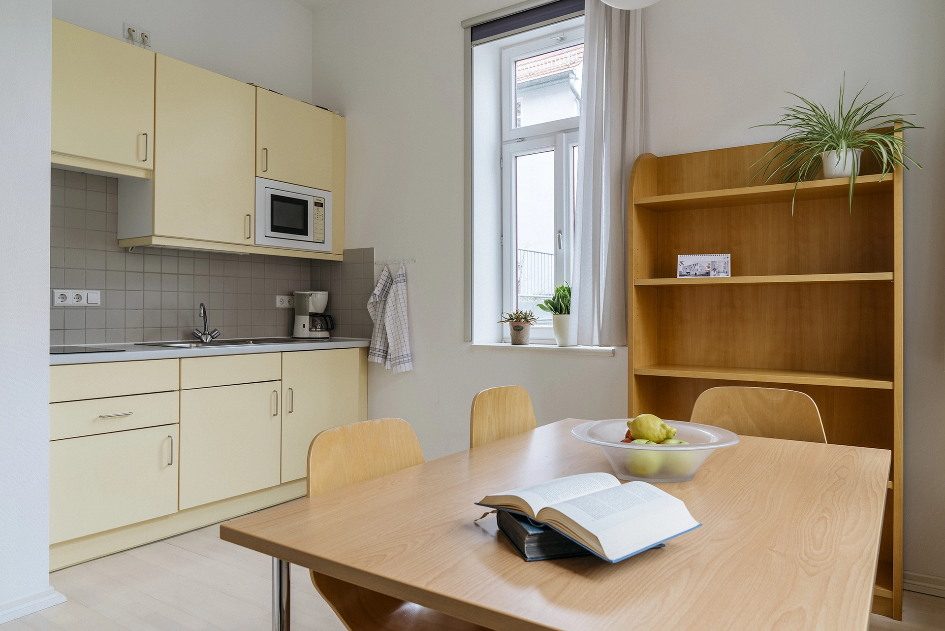 Im Keller des Gästehauses befindet sich zudem ein Waschraum, in dem die Bewohner des Hauses ihre Wäsche gebührenpflichtig waschen und trocknen können. Die Kosten pro Waschgang betragen 2,00 €, für das Trocknen 1,00 €. Bitte beachten Sie, dass für das Bezahlen an den Maschinen ausschließlich 50 Cent-Stücke genutzt werden können.