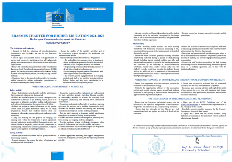 Der Universität Erfurt wurde eine Erasmus Charter for Higher Education (ECHE) für die Jahre 2021 bis 2027 zuerkannt.