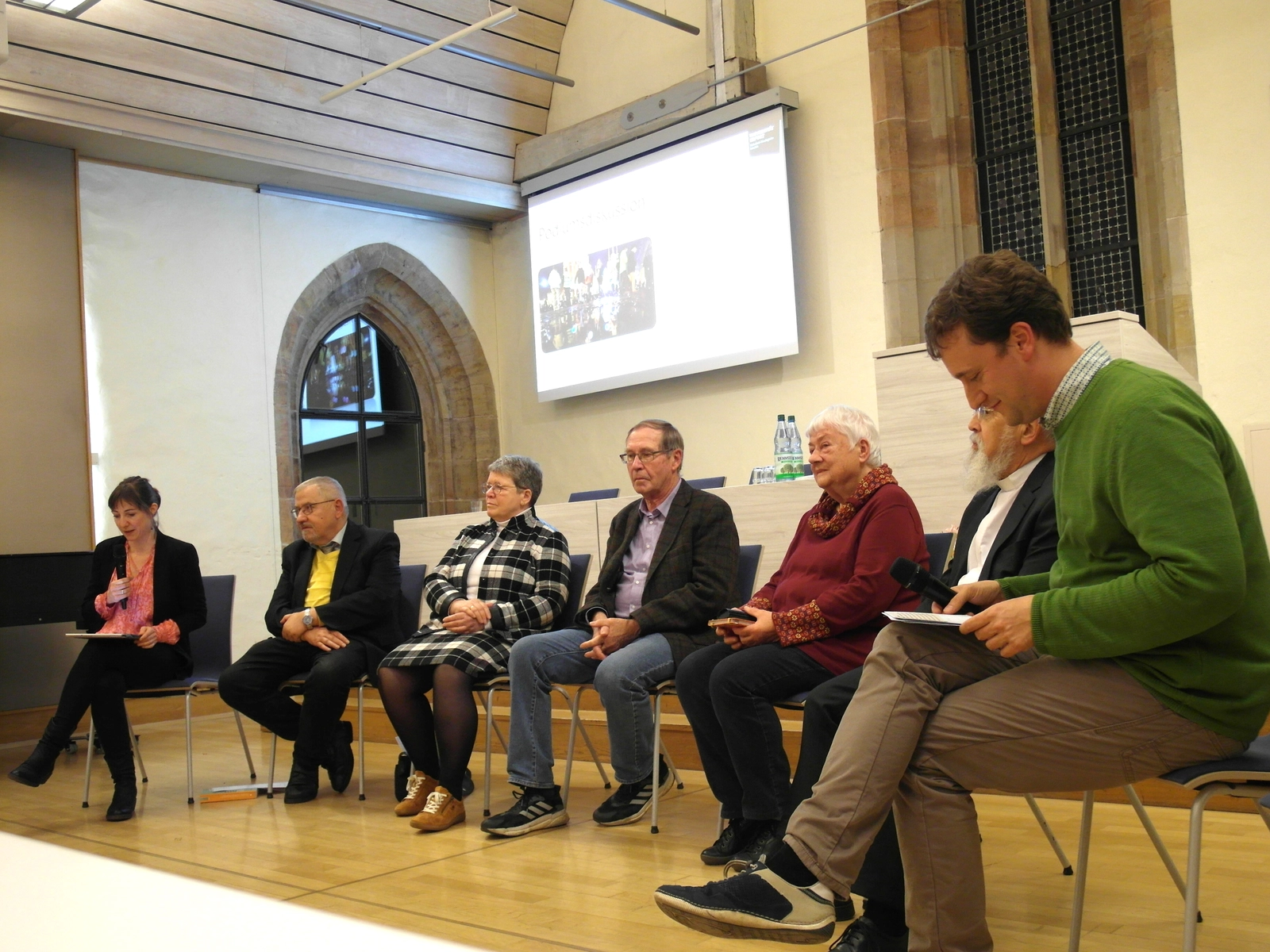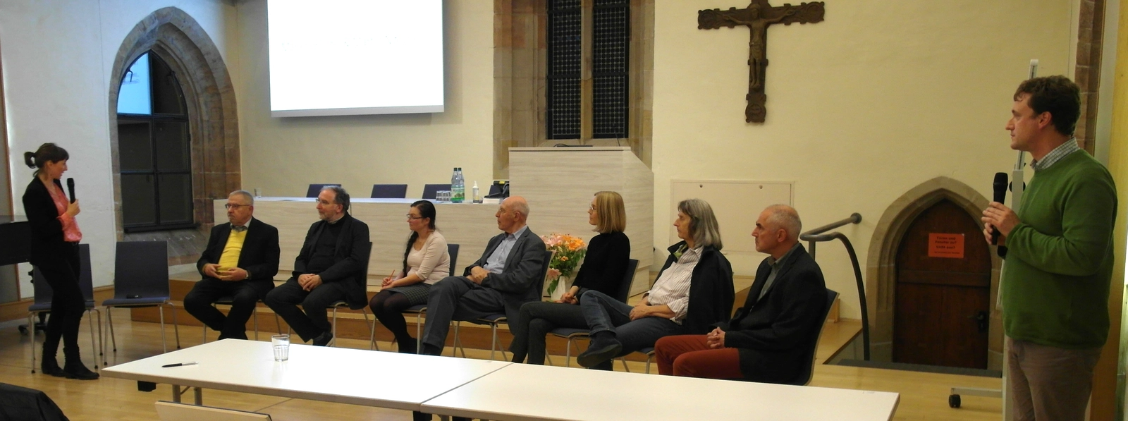 Auf die Vorstellung des Bandes folgte eine Podiumsdiskussion mit prominenten Gästen: mit Landesbischöfin i.R. Ilse Junkermann, die sich nach ihrer Amtszeit der Erforschung der kirchlichen Praxis in der DDR zugewendet hat, dem Magdeburger Bischof Dr. Gerhard Feige, dem emeritierten Leipziger Theologen Prof. Dr. Wolfgang Ratzmann, dem Erfurter Alttestamentler Prof. Dr. Norbert Clemens Baumgart und Gemeindereferentin i.R. Erika Buhl.