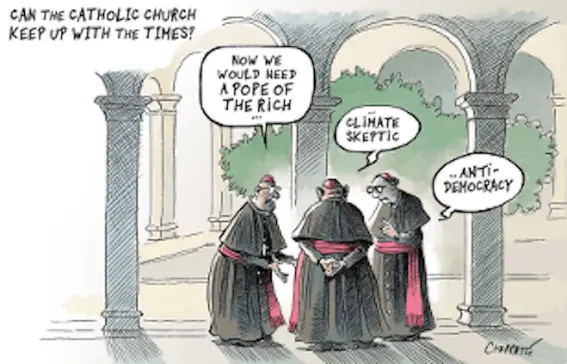 Die Karikatur präsentiert sich zunächst als einfacher satirischer Kommentar zum Zeitgeschehen. Drei Vertreter der katholischen Hierarchie, offensichtlich Kardinäle, beraten miteinander, was sie von einem Nachfolger für Papst Franziskus erwarten. Sie denken an „einen Papst der Reichen“, der „den Klimawandel infrage stellt“ und „antidemokratisch“ ist. Die als Titel über das Bild gesetzte Frage – „Kann die katholische Kirche mit der Zeit gehen und auf der Höhe der Zeit sein?“ – zielt offenbar darauf ab, dass ihre Überlegungen Ausdruck einer rückwärtsgewandten Haltung sind, die sich gegen Fortschritt und Moderne richtet.