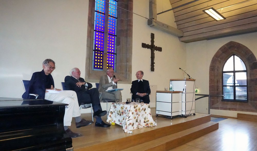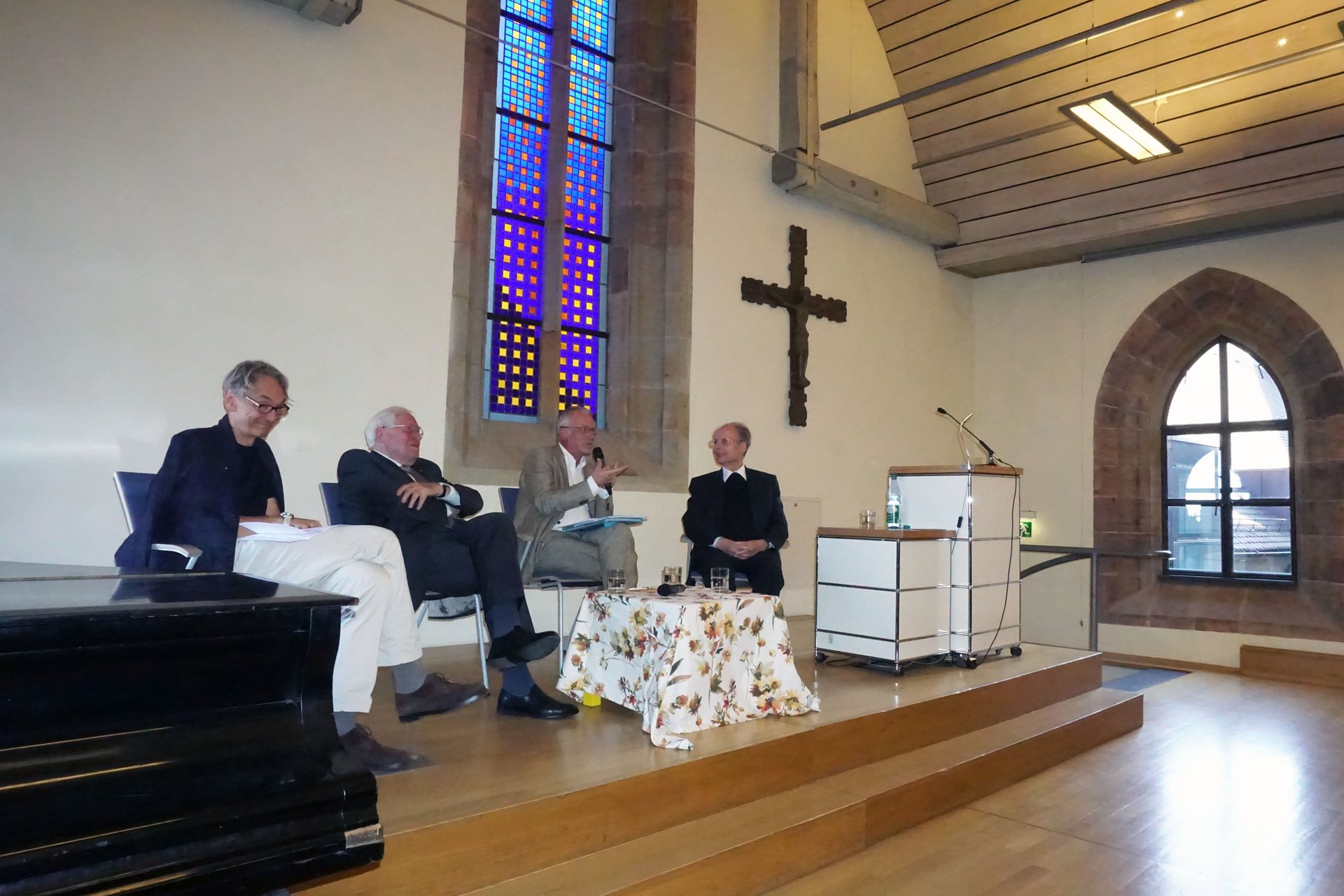 Im anschließenden Podiumsgespräch, das von Dr. Daniel Deckers (FAZ) moderiert wurde, diskutierten Dr. Vogel, Universitätspräsident Prof. Dr. Walter Bauer-Wabnegg und der Erfurter Altbischof Dr. Joachim Wanke über Aufgaben und Zukunft der Erfurter Theologie. Bischof Wanke warb engagiert für eine “geistliche Solidarität mit den Menschen vor Ort”. Kirche und Theologie müssten im Sinne einer Kontextualisierung die Menschen in Ostdeutschland kennen. Dies gehe nur aus einer räumlichen und geistigen Nähe heraus. Aus dieser Zeitgenossenschaft könne dann konstruktives und kreatives Potential entstehen, das der Theologie helfe, ihren Dienst und ihre Aufgabe zu erfüllen.