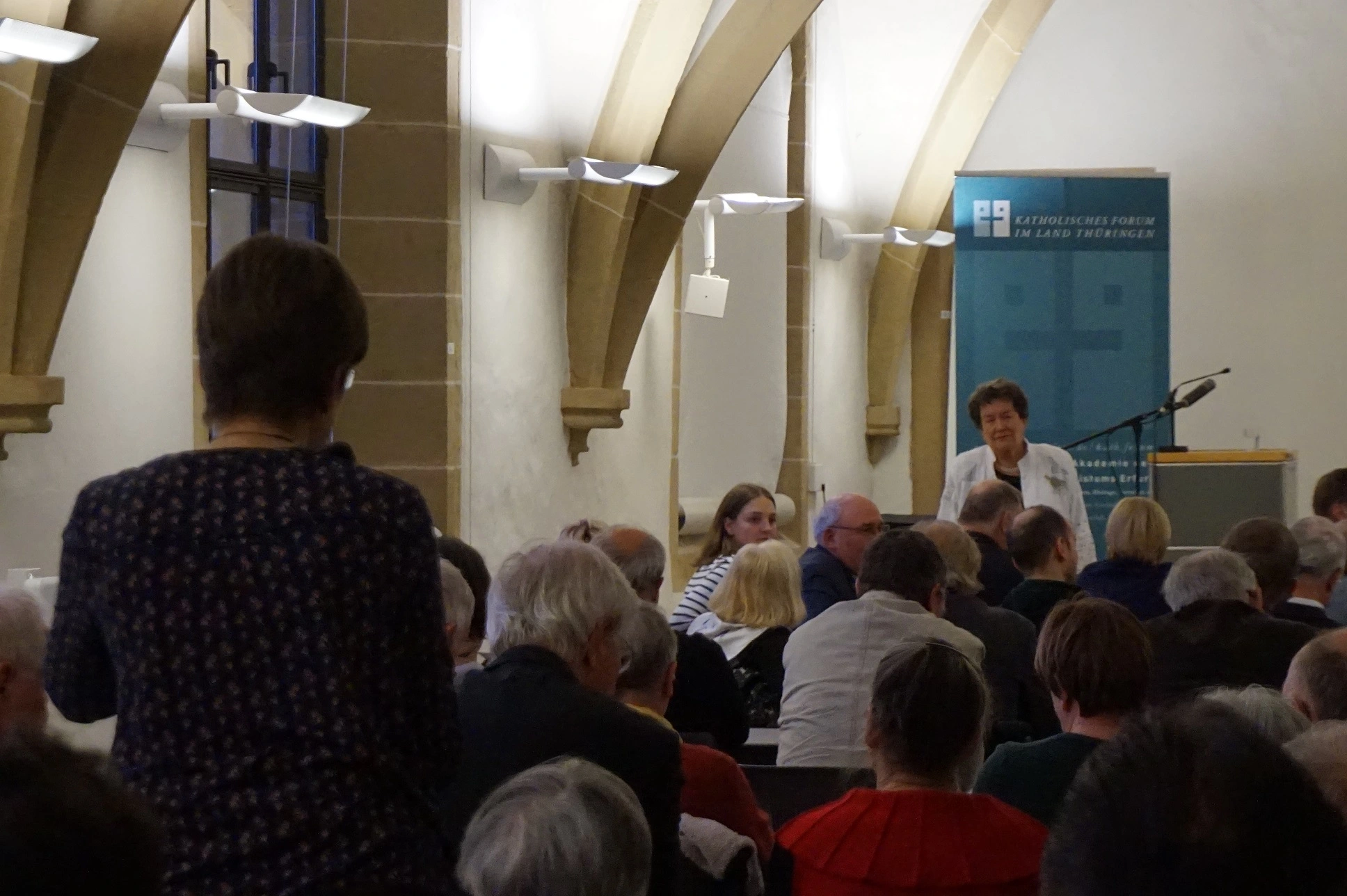 Nach Schipanski ist es damit die Aufgabe der Kirchen, sich mit einer starken Stimme in eine öffentliche Debatte um geistige und sittliche Grundhaltungen einzubringen – erst recht, wenn sowohl auf globaler als auch regionaler Ebene verstärkt ein Kampf gegen Aggressivität und Terrorismus geführt werde. Wie schon Papier betonte auch sie, dass nur die offene und vielfältige Diskussion Gesellschaft und Staat vor einem Abdriften in extreme Haltungen bewahren könne: “Das gesellschaftliche Klima muss sich wieder der Mitte der Gesellschaft zuwenden”, forderte sie, “und darf sich nicht über Randgruppen definieren. Hier unterstützt die Kirche den Staat.”