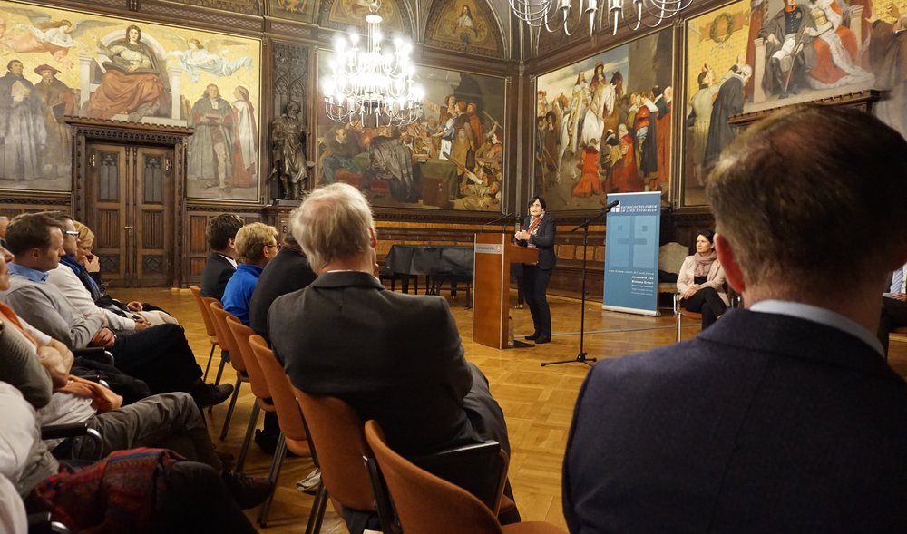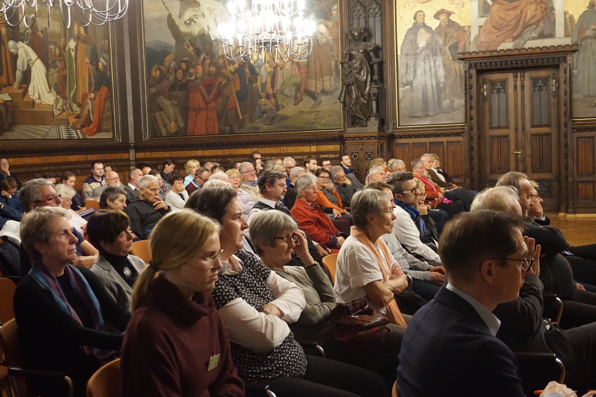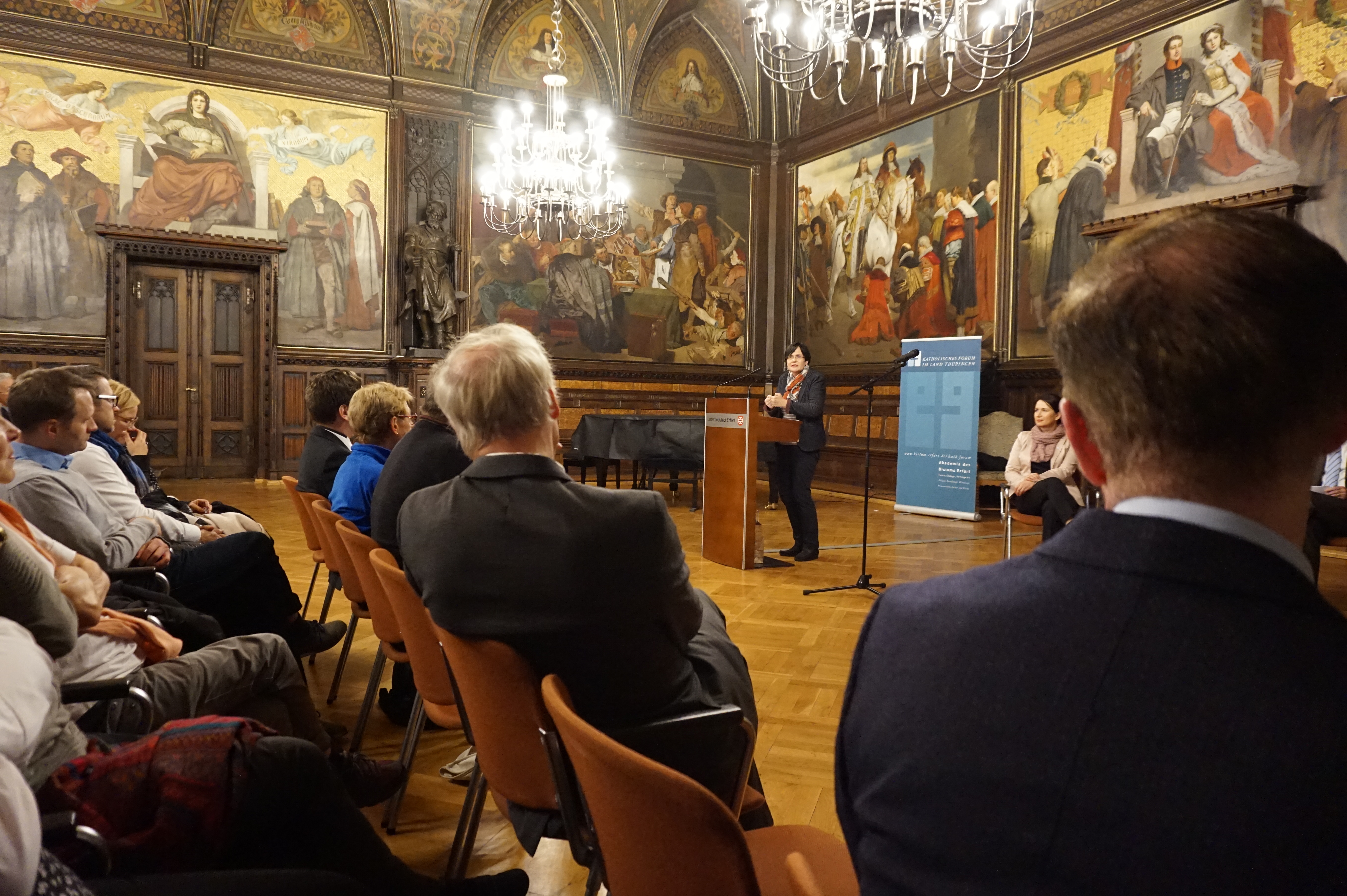 Die Rolle der Kirchen sahen die Diskutantinnen und Diskutanten dabei vor allem darin, einen scharfen und kritischen Blick auf das aktuelle Zeitgeschehen zu wahren. Kirche müsse stets eine aktive Gesprächspartnerin bleiben, die auch bewusst über ihre eigenen Grenzen hinausgeht. “Worauf ich stolz bin”, resümierte Michael Gabel, “ist, dass es uns gelingt, mit Menschen, die selber von sich sagen, dass sie keiner Religion angehören – dass wir uns mit ihnen gemeinsam als Verbündete fühlen in den Anliegen, die uns bewegen.” Gabel betonte damit die besondere Rolle der Kirchen im mehrheitlich areligiösen Thüringen. Christine Lieberknecht verwies in diesem Zusammenhang auch auf die ökumenischen Bemühungen sowie den fruchtbaren weltanschaulichen Dialog, der im Freistaat geführt werde: “Allein, dass wir uns heute Abend mit einer Veranstaltung, die von katholischen Bildungswerken getragen wird, hier im Festsaal des Rathauses zusammenfinden können – das ist doch großartig!”