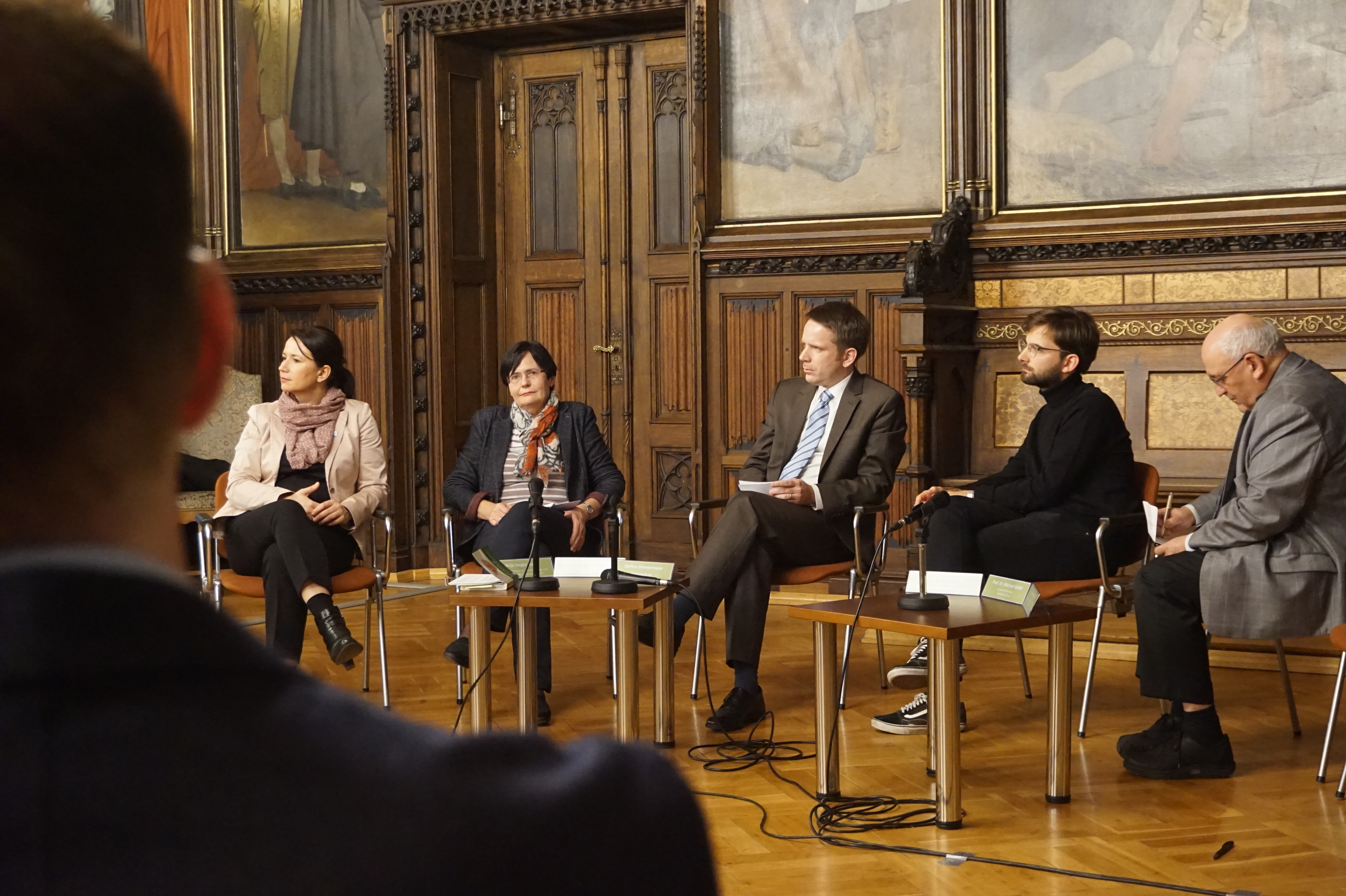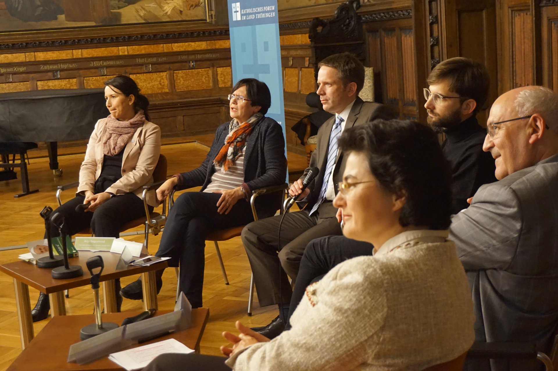 Auf dem Podium vertreten waren die ehemalige Ministerpräsidentin des Freistaates Thüringen, Christine Lieberknecht (CDU), die amtierende Thüringer Umweltministerin Anja Siegesmund (Bündnis 90/Die Grünen) sowie der Landesvorsitzende der Jusos Thüringen, Oleg Shevchenko. Theologische Schlaglichter auf die Diskussion brachten der Fundamentaltheologe Prof. Dr. Michael Gabel sowie die christliche Sozialethikerin Prof. Dr. Elke Mack von der Universität Erfurt ein.