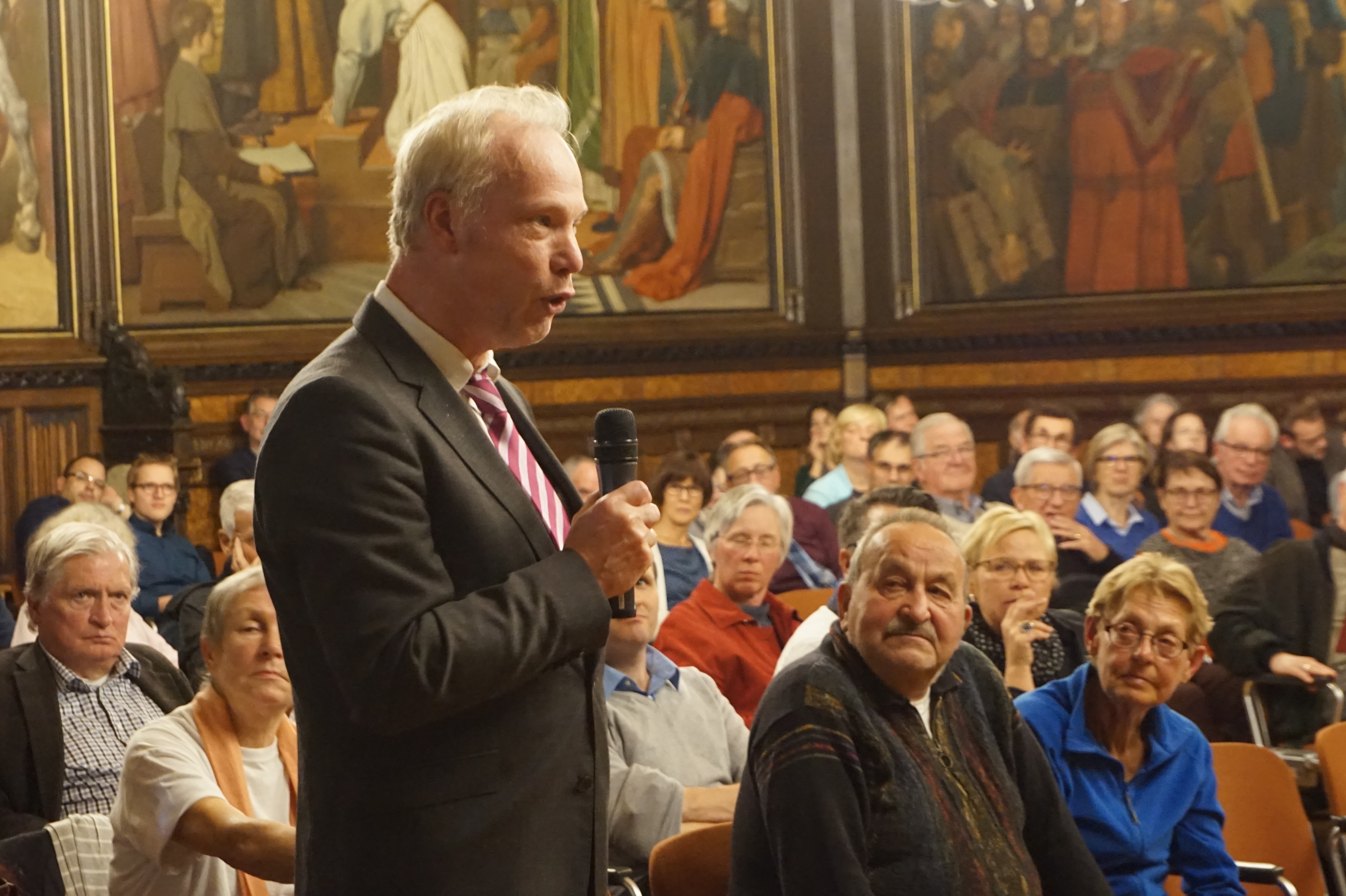 Unter der titelgebenden Frage des Abends, “In was für einer Welt wollen wir leben?”, griffen die Referentinnen und Referenten eine breite Palette aktueller Themen auf: Der Umgang mit globaler Ressourcenknappheit und ethische Verantwortung in internationalen Handelsbeziehungen wurde ebenso angesprochen wie dringende Fragen des Naturschutzes. Mit Blick auf Deutschland und insbesondere den Freistaat Thüringen diskutierte man weiterhin über Chancengleichheit etwa im Bildungswesen sowie ein Wohlstandsgefälle zwischen den alten und neuen Bundesländern und der damit verbundenen Gefährdung des sozialen Friedens. Uneinigkeit zeichnete sich vor allem in weltanschaulich geprägten Diskussionsbeiträgen ab, etwa in Fragen des Lebensschutzes und der aktuellen Debatte um §219.