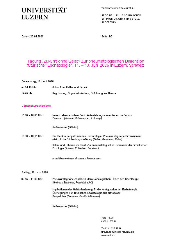 Bei dieser Tagung Vortrag von Notker Baumann: „Der Geist in der patristischen Eschatologie. Pneumatologische Dimensionen altkirchlicher Vollendungshoffung“