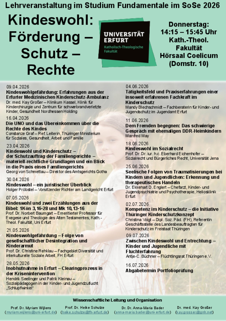Die Professur für Kirchenrecht lädt Sie herzlich zur Lehrveranstaltung „Kindeswohl: Förderung - Schutz - Rechte" im Sommersemester 2026 ein. Methodisch gesehen handelt es sich um eine Vorlesungsreihe, in der Experten:innen das Thema "Kindeswohl" aus verschiedenen Perspektiven heraus beleuchten.