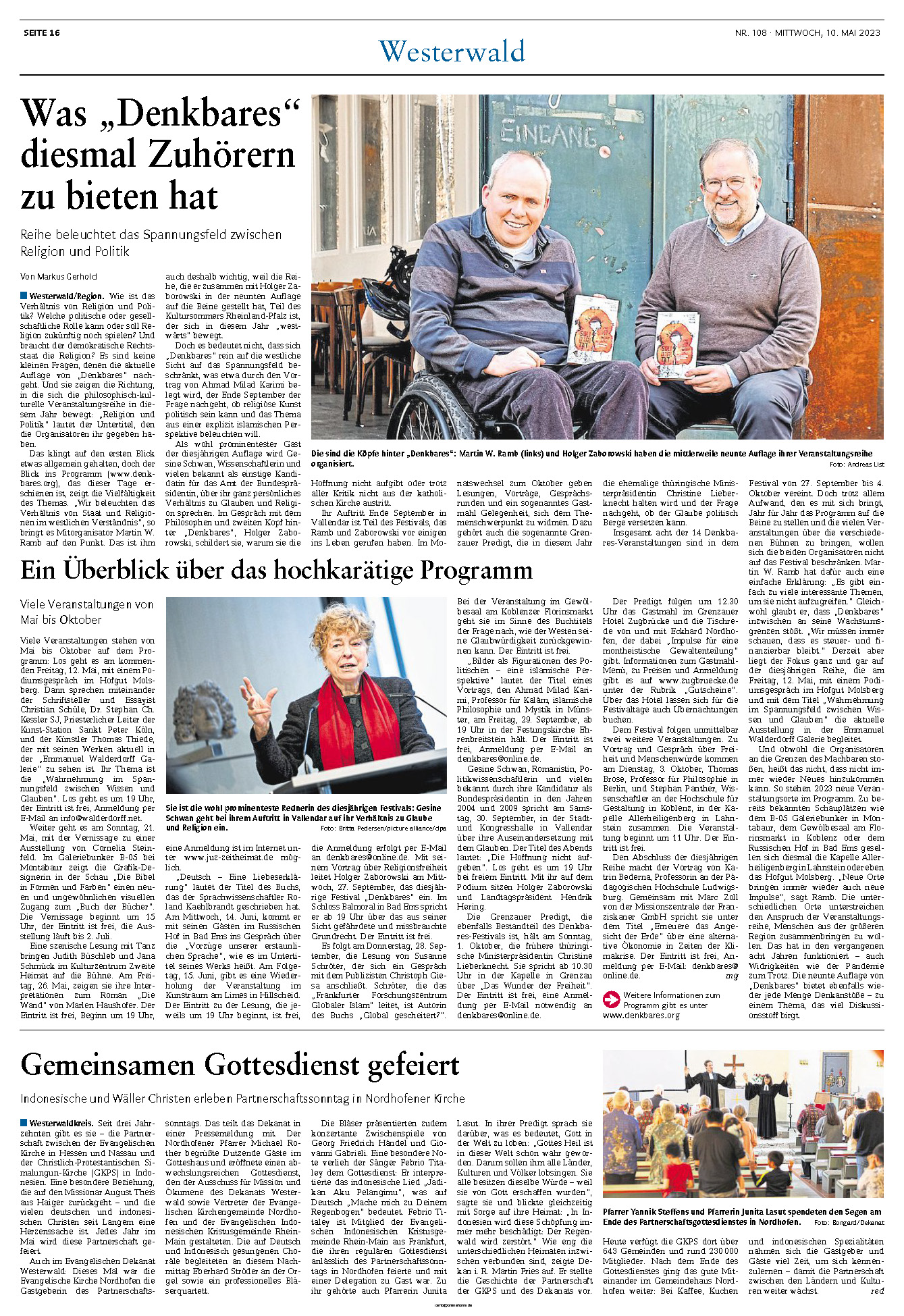 Das Veranstaltungs- und Themenformat DENKBARES geht in die 9. Runde. Die Zeitung "Westerwald" berichtet über das langjährige Projekt von Holger Zaborowski und Martin Ramb.