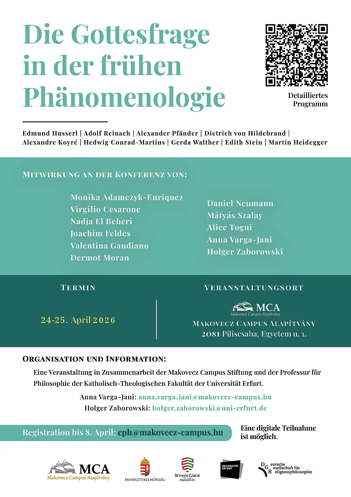 Vom 24. bis zum 25. April 2026 findet in Organisation von Holger Zaborowski und Anna Varga-Jani in Zusammenarbeit mit der Makovecz Campus Stiftung eine Konferenz zum Thema „Die Gottesfrage in der frühen Phänomenologie“ auf dem Makovecz Campus Alapítvány 2081 Piliscsaba, Egyetem u. 1. statt.