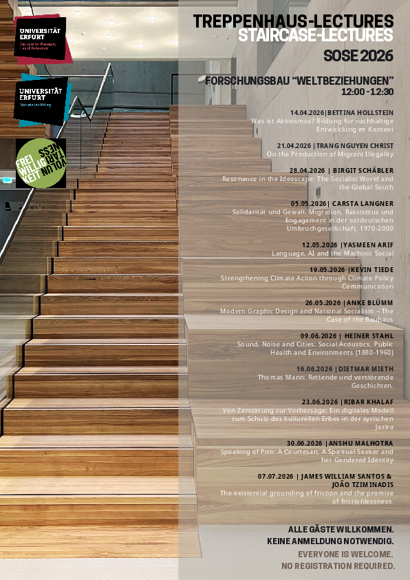 In den "Treppenhaus-Lectures" bieten Wissenschaftler*innen des Forschungsbaus “Weltbeziehungen” in kurzen Vorträgen spannende Einblicke in ihre Forschungsprojekte.