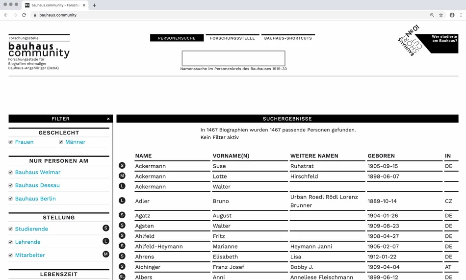 „Wir machen der Öffentlichkeit die Ergebnisse unserer jahrelangen Forschungen kostenlos zugänglich, um zum ersten Mal einen vollständigen Überblick über das Lehrpersonal, die Schülerschaft und die Gäste am Bauhaus zu ermöglichen“, erklärt Prof. Dr. Patrick Rössler, Leiter der Forschungsstelle. Unter der Internet-Adresse https://bauhaus.community/ ist jetzt ein digitales Personenlexikon verfügbar, das durchsuchbar ist und die wichtigsten biografischen Informationen zu jeder Person erschließt.