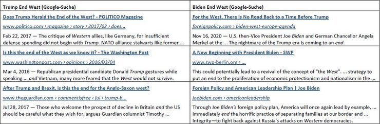 Mit dem 20. Januar 2021 und der Vereidigung von Joseph R. Biden Jr. als 46. Präsidenten der USA endet die Präsidentschaft von Donald J. Trump Jr. Was bedeutet das für „den Westen“ und seinem so oft zitierten Ende? Im oben abgedruckten Dokument finden sich je drei Ergebnisse von den ersten beiden Seiten aus der Google Suche zu „Trump End West“ bzw. zu „Biden End West“. Dieses Fundstück ist also ein Such-Stück und Anlass für dieses West Window.