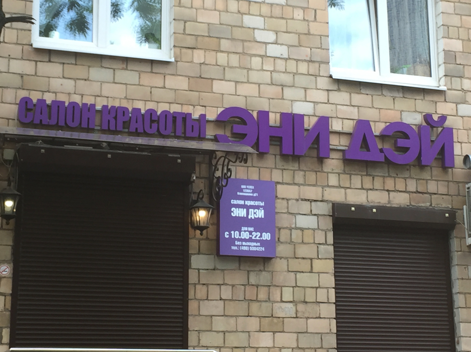 I see a sign in this Moscow, not far from the Catholic Cathedral and the Metro Station “Krasnopresnenskaja”, and I read its main words – the unique name of a business: Эни дэй.