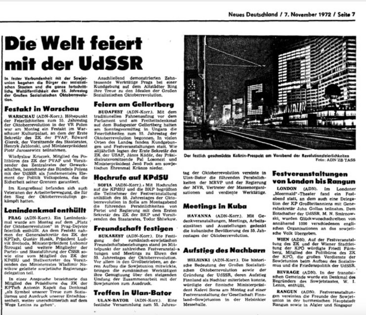 On the day of the anniversary of the “October Revolution“, the East German central Communist (Socialist Unity Party) newspaper “Neues Deutschland”, sporting a large headline celebrating the October Revolution on its front page, printed a small article on the event in Prague: