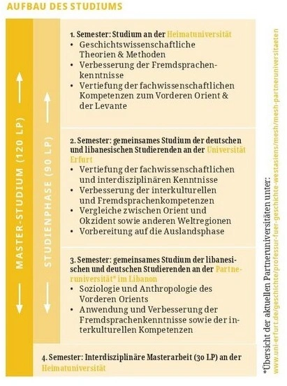 Geschichte und Gegenwart des Vorderen Orients hautnah zu studieren wird durch das gemeinsame Studium mit den libanesischen Kommilitonen in Erfurt und die fest in das Studienprogramm integrierte Auslandsphase im Libanon ermöglicht. Dieser Austausch dient der Vermittlung interkultureller Kompetenzen und wird durch den DAAD gefördert. Die theoretisch erworbenen Kompetenzen und Sprachkenntnisse zur Weltregion des Vorderen Orients werden so um praktische Erfahrungen vor Ort ergänzt. Darüber hinaus findet auch ein Austausch von Gastdozenten statt.