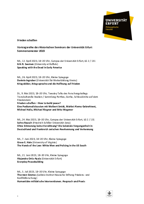 Das Historische Seminar lädt im Sommersemester zu einer Vortragsreihe "Frieden schaffen" ein. Über Themen und Termine informiert die nachstehende Liste.