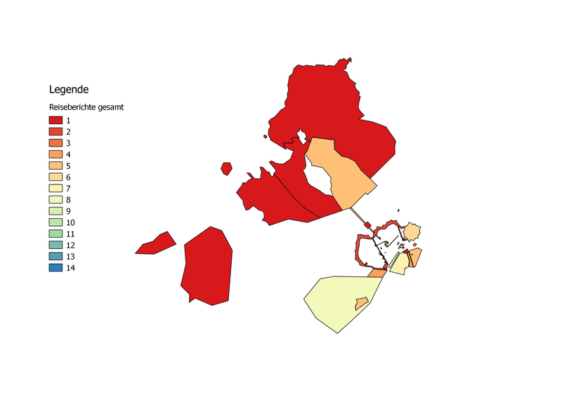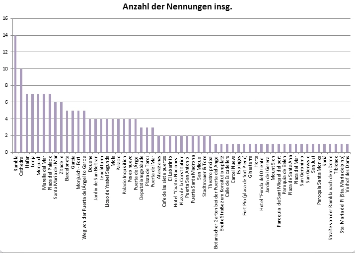 Insgesamt werden in den neun Reiseberichten 59 räumliche Objekte der Stadt Barcelona und ihrer nächsten Umgebung insgesamt 180 Mal genannt [Abb. 1], wobei – wenig erstaunlich – die Ramblas mit 14 Nennungen am häufigsten vertreten sind, gefolgt von der Kathedrale mit zehn Nennungen. Der Hafen, die Lonja (Handelsbörse), der Berg Montjuich, die Muralla del Mar (meerseitige Stadtmauer) und die Plaza del Palacio werden je sieben Mal genannt, ferner gibt es 24 Einzelnennungen [Abb. 2]. Betrachtet man die räumliche Verteilung [Abb. 3], so ergibt sich auf den ersten Blick, dass die Gebiete an der Peripherie mit Ausnahme des Bergs Montjuich und seines Forts sowie des beliebten Ausflugsziels Gracia nur sehr vereinzelt vorkommen.
