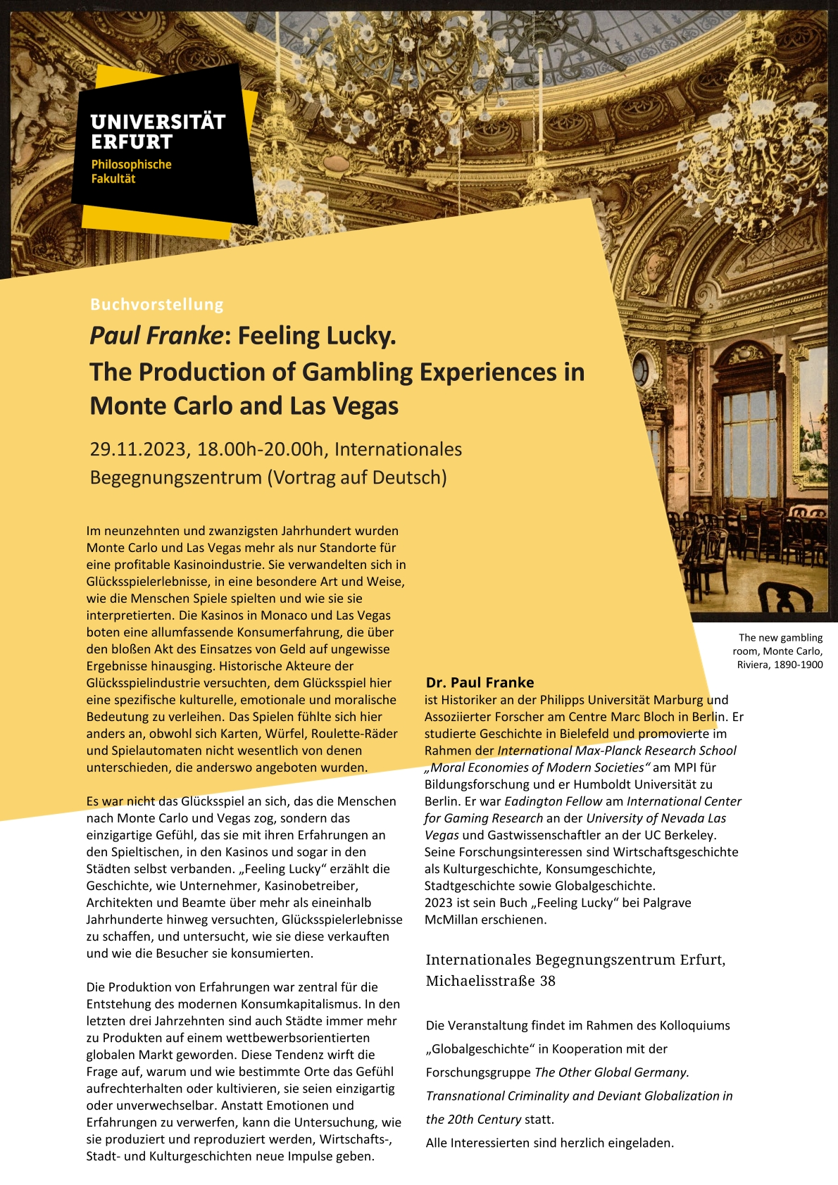 Am 29. und 30. November 2023 fand das diesjährige Kolloquium der Professur für Globalgeschichte in Kooperation mit der Forschungsgruppe "The Other Global Germany. Transnational Criminality and Deviant Globalization in the 20th Century" statt, zu dem Promovierende und Postdocs zusammenkamen, um ihre laufenden Forschungsprojekte zu diskutieren. In diesem Rahmen fand auch ein öffentlicher Abendvortrag statt: Dr. Paul Franke (Uni Marburg/Centre Marc Bloch) stellte sein gerade erschienenes Buch "Feeling Lucky. The Production of Gambling Experiences in Monte Carlo and Las Vegas" vor.