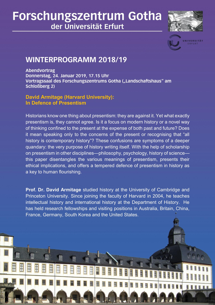 Prof. Dr. David Armitage (Harvard): „In Defence of Presentism“. Der Vortrag war Teil des Winterprogramms der Vortragsreihe des Forschungszentrums Gotha der Universität Erfurt.
