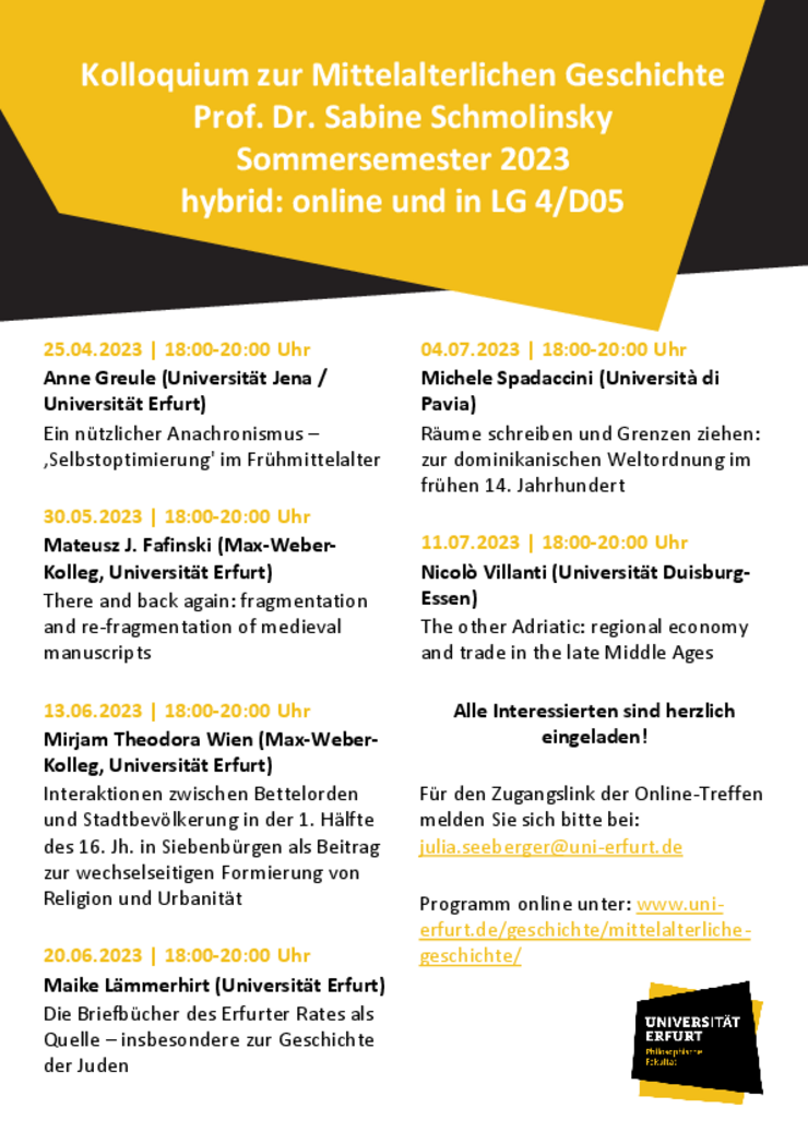 Im Wintersemester 2025/26 findet das Kolloquium zur Mittelalterlichen Geschichte unter dem Titel „Aktuelle Forschungen zur Geschichte des Mittelalters" jeweils dienstags von 18-19.30 Uhr in einer hybriden Form statt. Das Programm dafür finden Sie hier.