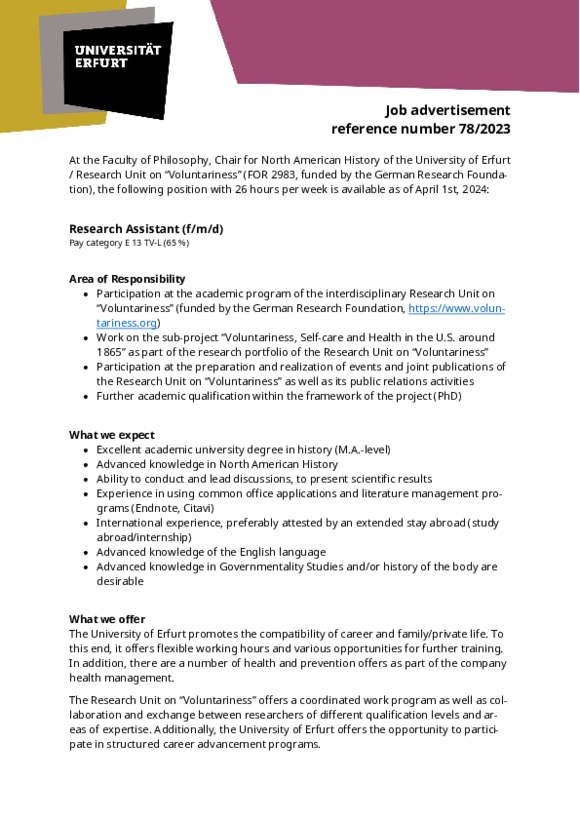 An der Universität Erfurt ist eine Promotionsstelle im Fach Nordamerikanische Geschichte bei der DFG-Forschungsgruppe „Freiwilligkeit“ zu vergeben. Bewerbungen für die Stelle als Wissenschaftliche*r Mitarbeiter*in am Historischen Seminar der U Erfurt…