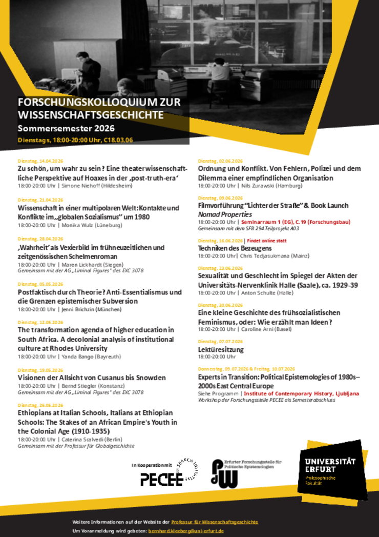 Das Programm des Forschungskolloquiums zur Wissenschaftsgeschichte im Sommersemester 2026 ist nun online. Wir freuen uns, unsere Gastredner:innen in Erfurt begrüßen zu dürfen!