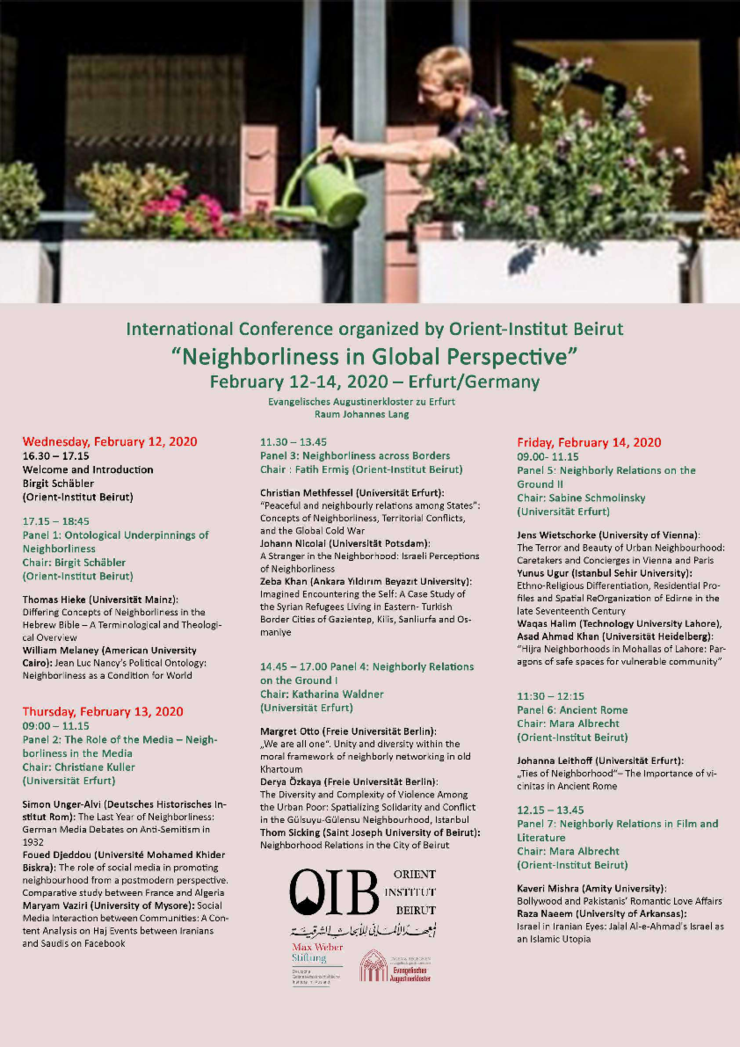 Die Konferenz wurde von Prof. Dr. Birgit Schäbler, Professorin für Geschichte Westasiens und seit 2017 Direktorin Orient-Instituts Beirut (OIB), konzipiert. Sie ist Teil des Forschungsprofils "Relations" des OIB und korreliert mit dem Profilschwerpunkt "Beziehungen" des Historischen Seminars. Die Erfurter Mitglieder der Arbeitsgruppe "Beziehungen" nehmen an der Konferenz teil.