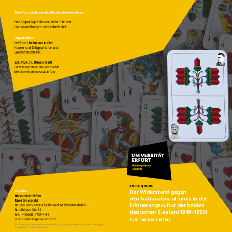Das Historische Seminar der Universität Erfurt lud alle Interessierten zum Kolloquium "Der Widerstand gegen den Nationalsozialismus in der Erinnerungskultur der beiden deutschen Staaten (1949-1990)" am 05. und 06. Februar 2020 ein.