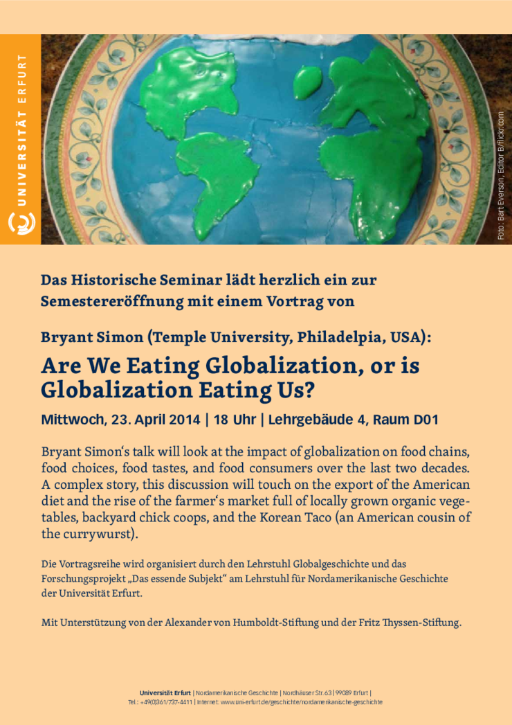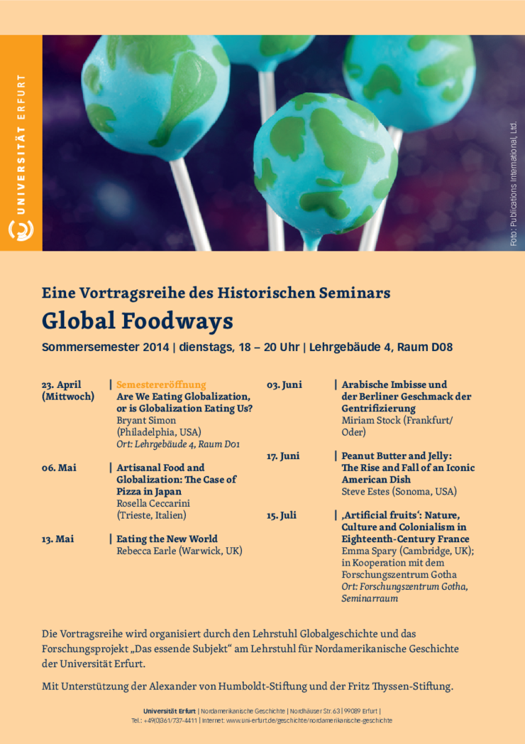 Im Rahmen der Vortragsreihe “Global Foodways” lud das Historische Seminar der Universität Erfurt alle Interessierten herzlich zur Eröffnung des Sommersemesters 2014 ein.