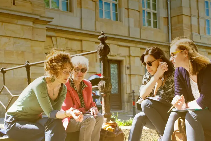 Die wöchentliche intensive Beschäftigung mit dem Dornheim-Konvolut ermöglichte den SWK-Studierenden Viola Baser, Daniel Baumbach, Sarah Kühnel, Mandy Nette, Judith Thomann, Johanna Weißler und Alina Zeller Erfahrungen beim praktischen und theoretischen Umgang mit dem Werkbestand. Neben dem konservatorisch sachgerechten Umgang mit den Bleistift-, Feder- und Pinselzeichnungen thematisierte das Seminar vor allem Zuschreibungsfragen. Daher bildete das vergleichende, kritische Sehen den gewichtigen Schwerpunkt der Zusammenkünfte, flankiert von Fragen zur Provenienz, zur Bildanalyse und Motivkunde, die intensiv diskutiert wurden. Zeichentechnologie und Materialbeschaffenheit standen ebenso im Focus wie Biografie und Zeitkontext. ...mehr lesen