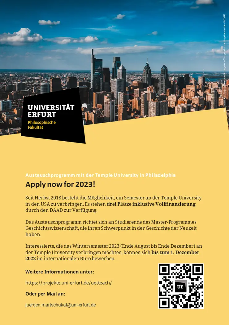 Seit Herbst 2018 besteht für unsere Studierenden die Möglichkeit, ein Semester an der Temple University in Philadelphia, PA zu verbringen. Das Austauschprogramm richtet sich an Studierende des Master-Studiengangs Geschichtswissenschaft, die ihren Schwerpunkt in der Geschichte der Neuzeit haben.