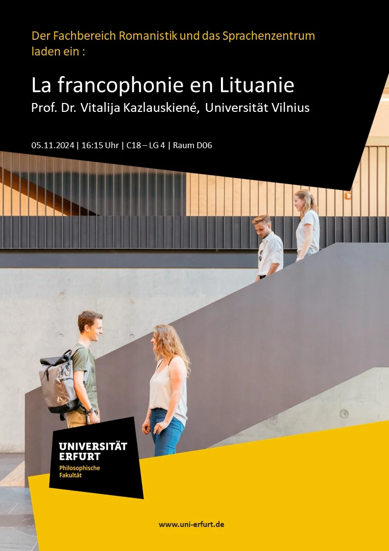 Der Fachbereich Romanistik und das Sprachenzentrum laden ein zum Vortrag von Frau Prof. Dr. Vitalija Kazlauskienė am 05.11.2024 um 16:15 Uhr ins Lehrgebäude 4 - C18, Raum D06: