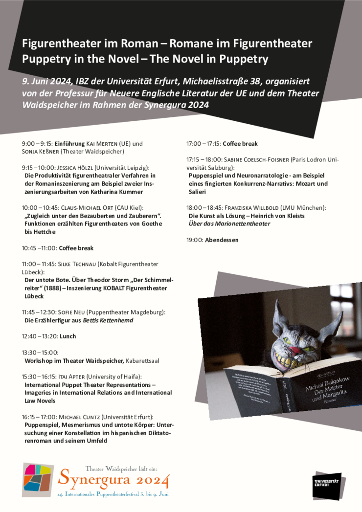 Im Rahmen des Festivals Synergura 2024 veranstaltet die Professur für Neuere Englische Literatur zusammen mit dem Theater Waidspeicher den Workshop Figurentheater im Roman - Romane im Figurentheater. Von 16:15 Uhr bis 17:00 Uhr hält Herr Prof. Dr. Cuntz seinen Vortrag Puppenspiel, Mesmerismus und untote Körper: Untersuchung einer Konstellation im hispanischen Diktatorenroman und seinem Umfeld.