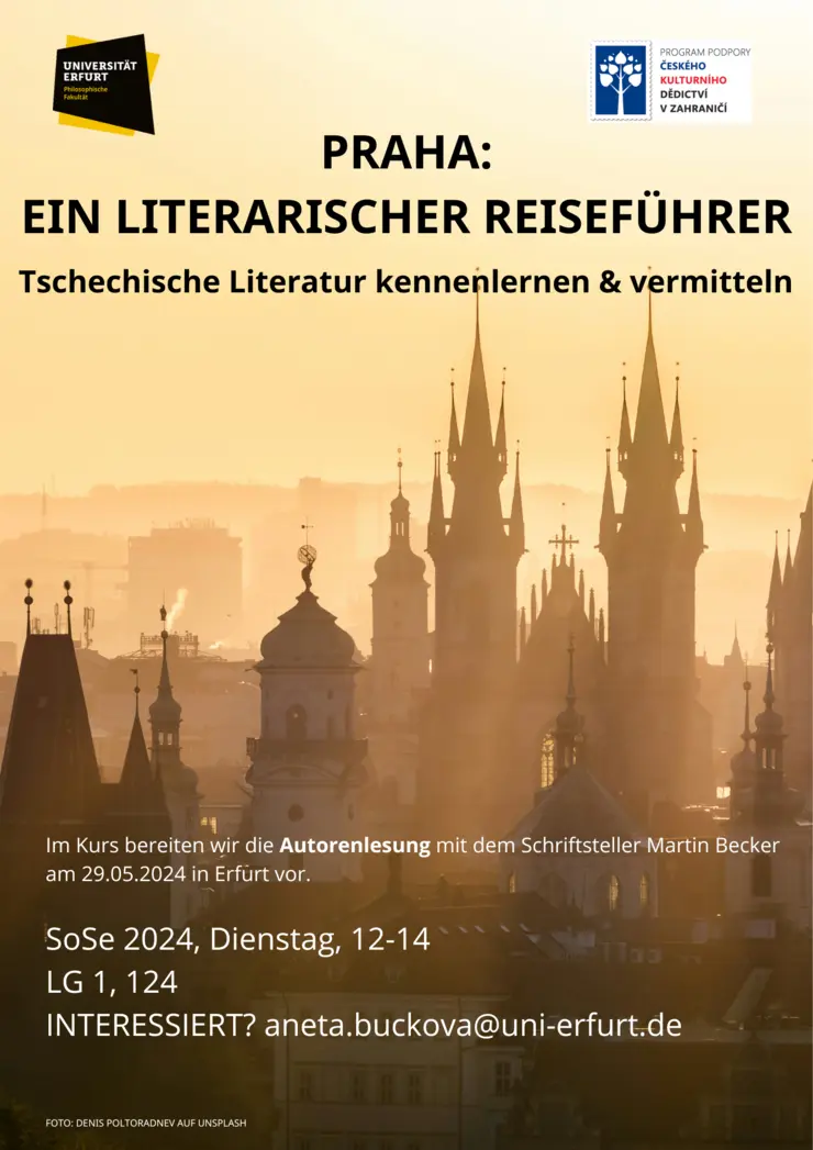 Außer der Kenntnisse der tschechischen Literatur und Landeskunde konzentrieren wir uns auf die unterschiedlichen Möglichkeiten der Literaturvermittlung. Einen wesentlichen Bestandteil des Kurses stellt die Vorbereitung und Durchführung der Autorenlesung mit dem Schriftsteller Martin Becker dar, der am 29. Mai 2024 auf unsere Einladung nach Erfurt kommen wird. Bei Interesse können die Teilnehmenden auch bei der Vorbereitung eines literaturvermittelnden Beitrags für die Lange Nacht der Wissenschaften im November 2024 mitwirken.