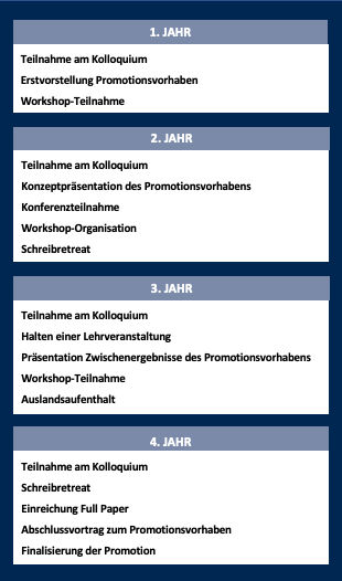 Die Promovend:innen entwickeln ein Lehrveranstaltungskonzept für den BA, thematisch angelehnt an das Dissertationsthema; sie erstellen Semesterablaufplan, Prüfungsleistungen und didaktisches Konzept und führen diese Veranstaltung durch.