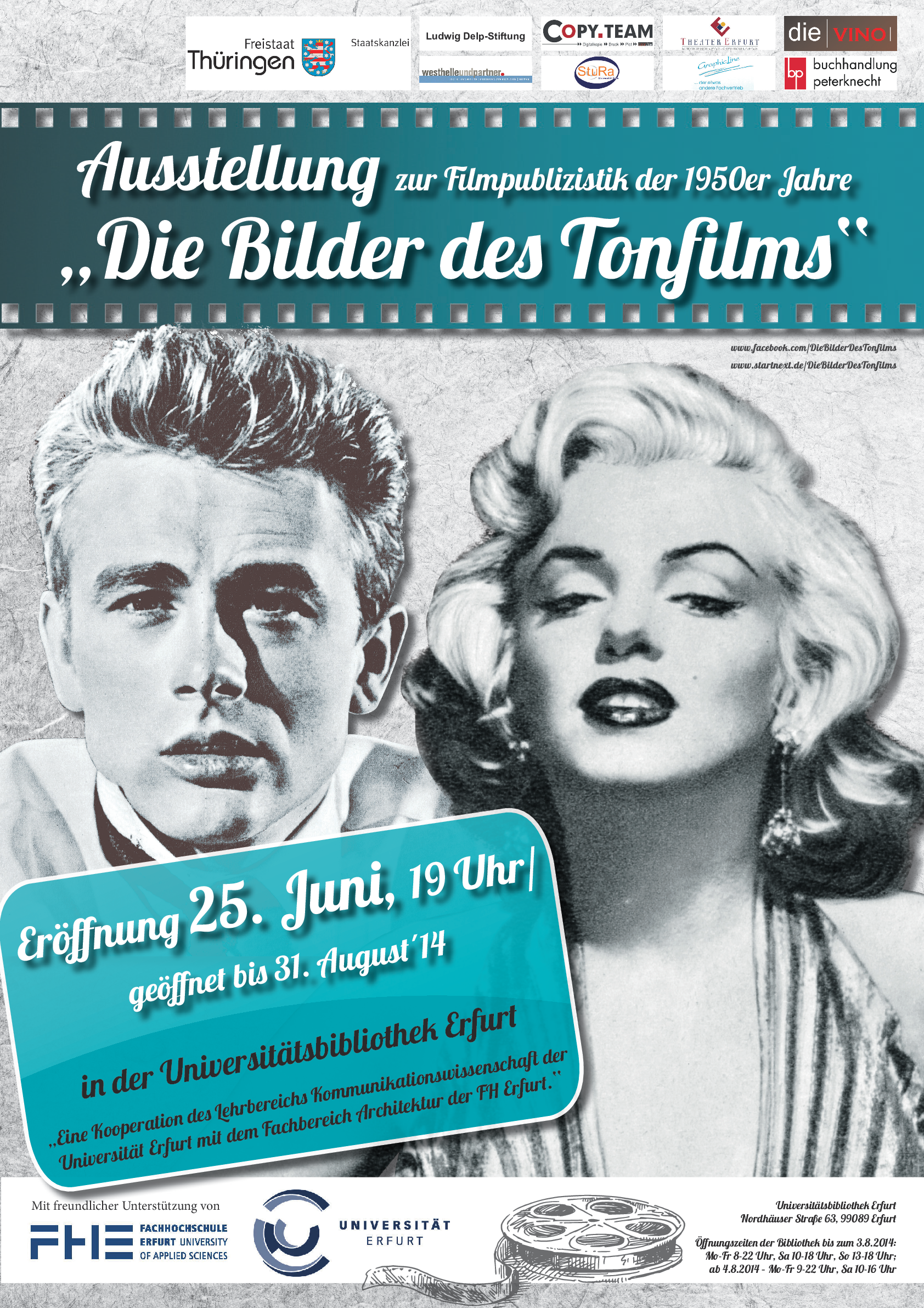 In einem zweisemestrigen Praxis-Lehrprojekt haben Studierende beider Häuser die Inhalte erarbeitet, in ein Ausstellungskonzept umgesetzt und dieses realisiert. Wir danken beiden Hochschulen für die ideelle und finanzielle Unterstützung bei der Einrichtung der Ausstellung und der Herstellung der Begleitmaterialien. Die Exponate entstammen im Wesentlichen der "Wasserburger Sammlung" zur Filmpublizistik von Anton Fuchs, die 2013 in Teilen von der Universitäts- und Forschungsbibliothek Erfurt/Gotha übernommen werden konnte. Unser Dank gilt insbesondere Manfred Heiting (Malibu, USA) und Jörg Ammann (Baden-Baden), die durch ihre großzügige Unterstützung (neben weiteren ungenannten Spendern und der Staatskanzlei des Landes Thüringen) den Ankauf und die Erschließung dieser Sammlung ermöglicht haben.