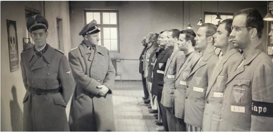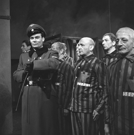 Nackt unter Wölfen (1963) – In der zweiten Verfilmung wird die Härte der SS gegenüber Kapo und Zwangsarbeitern der Effektenkammer verdeutlicht. Reineboth und Kluttig treten Höfel und Kropinski gegenüber, um Informationen über den kleinen Jungen und das Internationale Lagerkomitee zu entlocken.