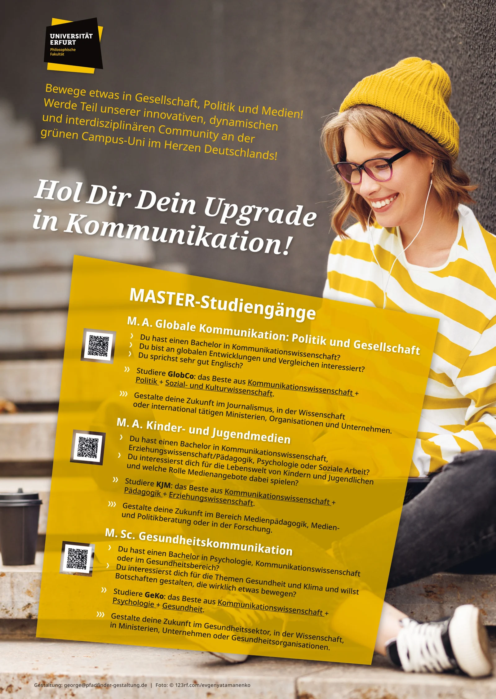 Unser Angebot umfasst einen Bachelor-Studiengang sowie drei forschungsorientierte Master-Studiengänge. Zudem fördern wir als Seminar für Medien- und Kommunikationswissenschaft auch die weiterführende Qualifikation im Rahmen einer Promotion. Hierfür haben wir gemeinsam mit der Forschergruppe "Communication and Digital Media" ein strukturiertes Promotionsstudium etabliert.