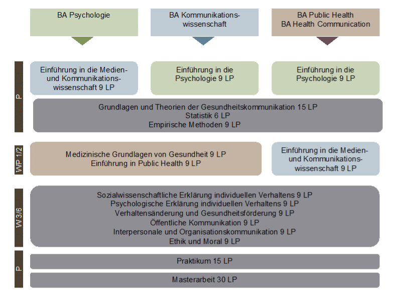 Die viersemestrige Regelstudienzeit des Master-Studiengangs "Gesundheitskommunikation" umfasst eine dreisemestrige Studienphase und ein Semester zur Erstellung der Masterarbeit. In einem Praktikum sollen Kontakte und Erfahrungen mit der Praxis vertieft werden. Partner aus der Gesundheitspolitik, Gesundheitsberichterstattung, Gesundheitskommunikation und Gesundheitswirtschaft bereichern das Lehrangebot und bieten Anknüpfungspunkte für eigene Erfahrungen, Praktika und Masterarbeiten.