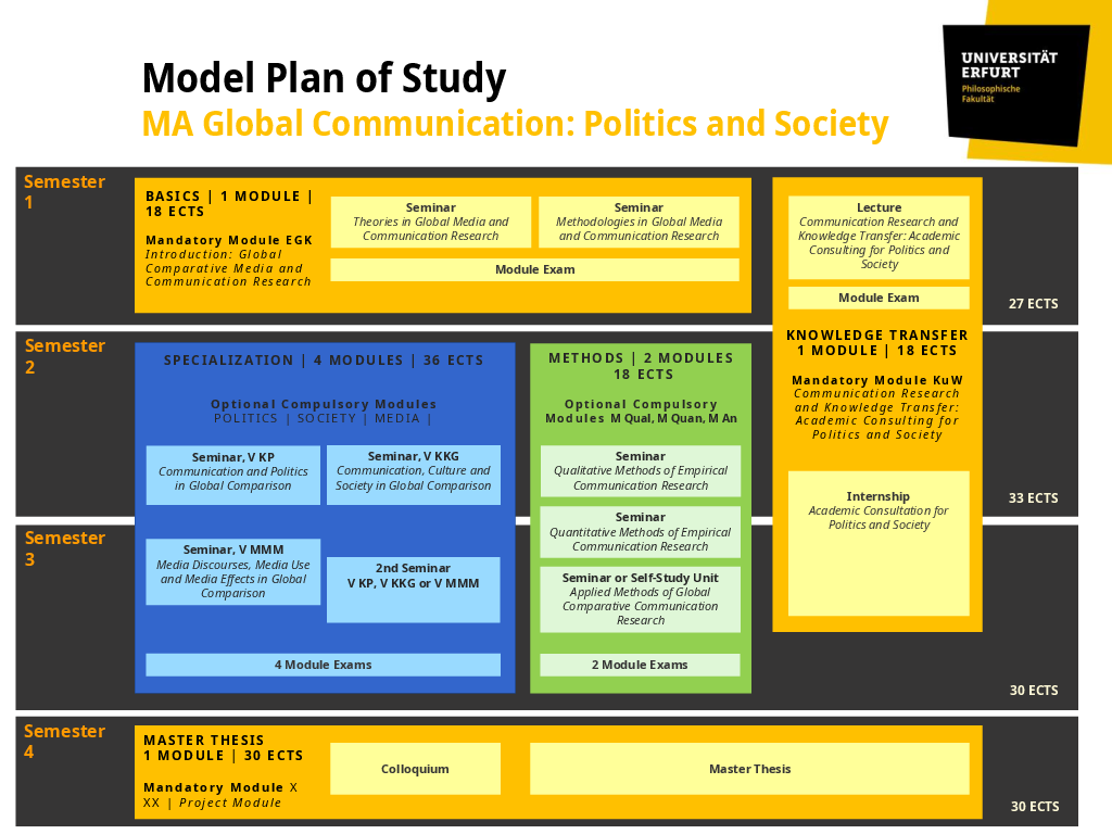 Das Studium des MA "Globale Kommunikation: Politik und Gesellschaft" besteht aus einem grundlegenden Einführungsmodul zu Theorien und Methoden der global vergleichenden Kommunikationsforschung im 1. Semester, vier inhaltlichen Vertiefungsmodulen in den Bereichen a) Politik, b) Gesellschaft, und c) Medien im Verlauf der ersten drei Semester, zwei Methodenmodulen im 2. und 3. Semester sowie zwei aufeinander aufbauenden Modulen, die in kommunikationswissenschaftliche Beratungspraxis einführen und mit einem international orientierten Praktikum im In- oder Ausland abschließen. Die Master-Arbeit wird im 4. Semester geschrieben und in einem Kolloquium präsentiert.
