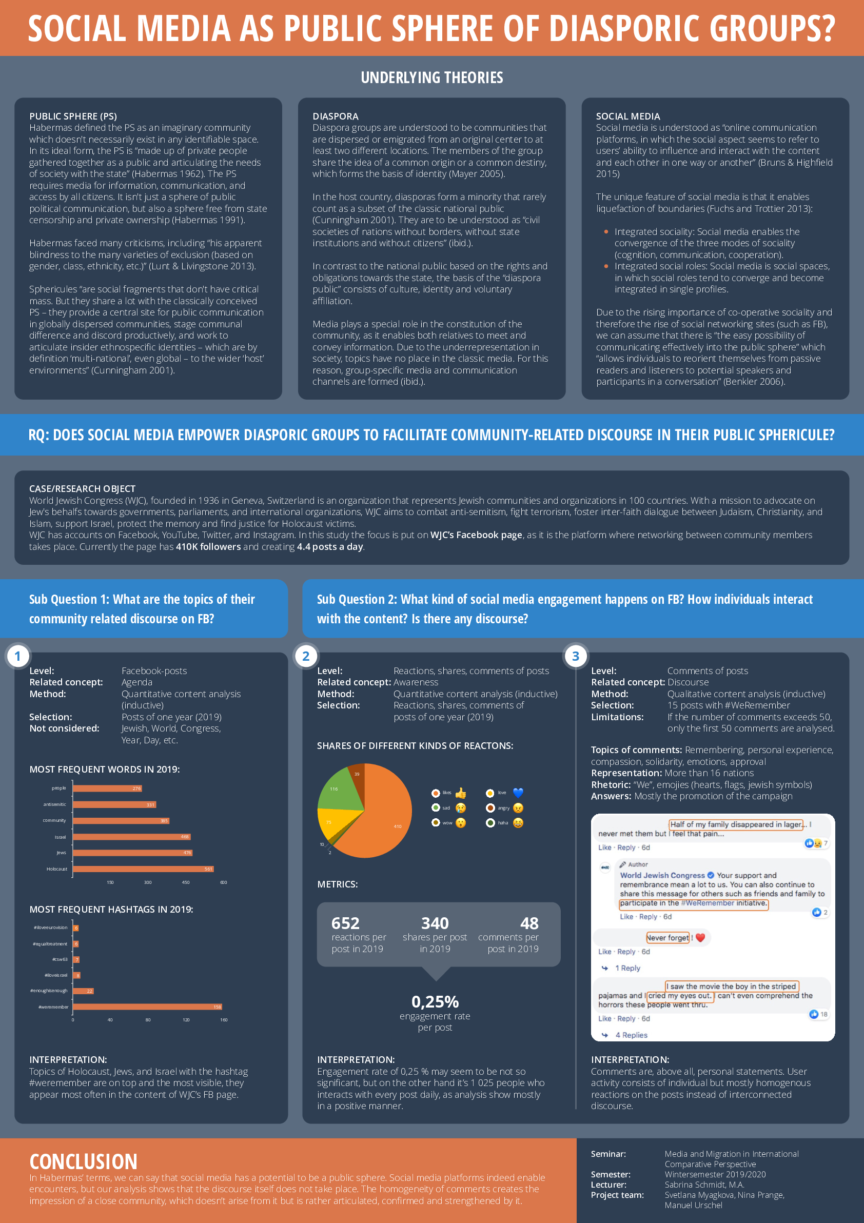 "This study examines the potential of social media as a communicative channel to facilitate community-related discourse in diasporic public sphericules. Indeed, in Habermas’ terms, we can say that social media has the potential to be a public sphere enabling social encounters. However, our analysis shows that the discourse itself does not take place – the homogeneity of comments creates the impression of a close community, which doesn’t arise from it but is rather articulated, confirmed, and strengthened by it."