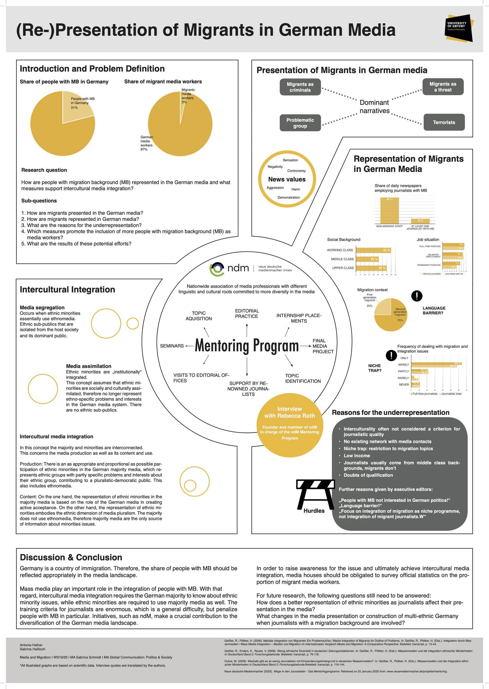 "With a 25,5 percent share of people with a migration background, Germany is one of the largest immigration countries in Europe. Looking at the proportion of journalists with a history of migration, however, the discrepancy with the migrant population is astonishing: only about three percent of media workers come from a non-German background. This discrepancy caught our interest and led to an analysis on how people with a history of migration are presented and represented in German media and what measures support an intercultural media integration. We concluded, that a successful cultural media integration requires the majority to be informed about minority issues. At the same time, minorities are required to use majority media as well. The hurdles are enormous for all aspiring journalists, but particularly affect people with a history of migration. Initiatives such as the Neue Deutsche Medienmacher make a positive, crucial contribution to the diversification of the German media landscape."