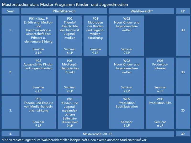 - Grundlagen: Kindheit – Medien – Jugend (PM 01): Überblick über Grundbegriffe, historische Entwicklung von Kinder- und Jugendmedien, Verlauf von Sozialisationsprozessen durch Medien, Aspekte der Medienethik (12 LP)