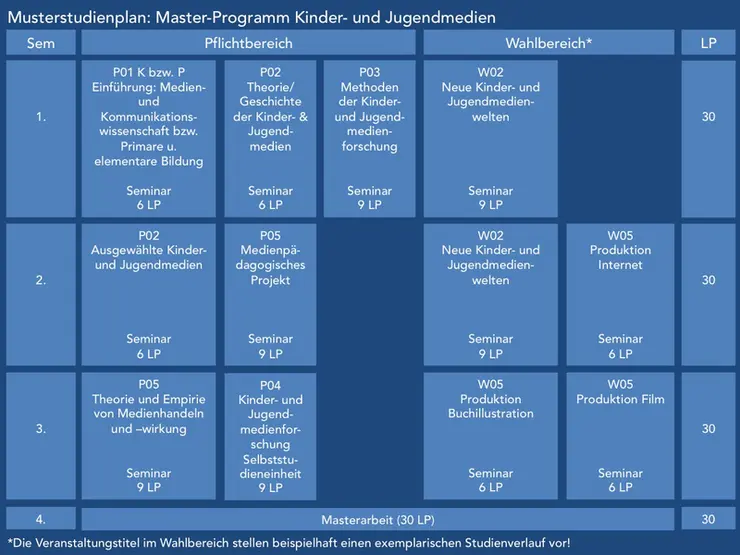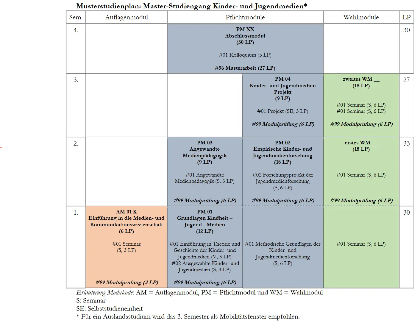 - Empirische Kinder- und Jugendmedienforschung (PM 02): Anlage komplexer empirischer Forschungsprojekte über und mit Kindern und Jugendlichen, deren theoretische Fundierung und angemessene Präsentation von Befunden (18 LP)