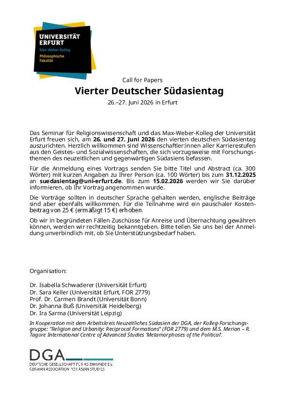 Vierter Deutscher Südasientag Erfurt, 26. und 27. Juni 2026: Call for Papers