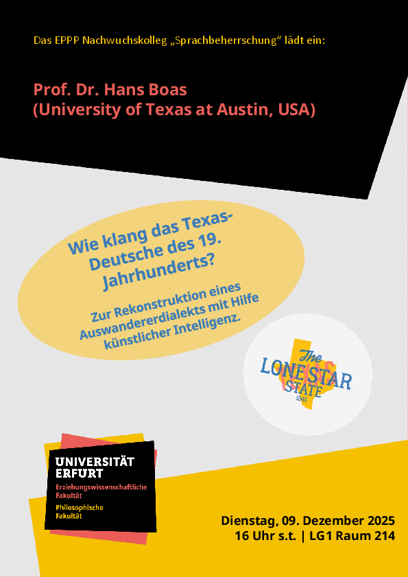 – Gastvortrag – Prof. Dr. Hans Boas (University of Texas at Austin, USA) – Wie klang das Texas-Deutsche des 19. Jahrhunderts? Zur Rekonstruktion eines Auswandererdialekts mit Hilfe künstlicher Intelligenz.