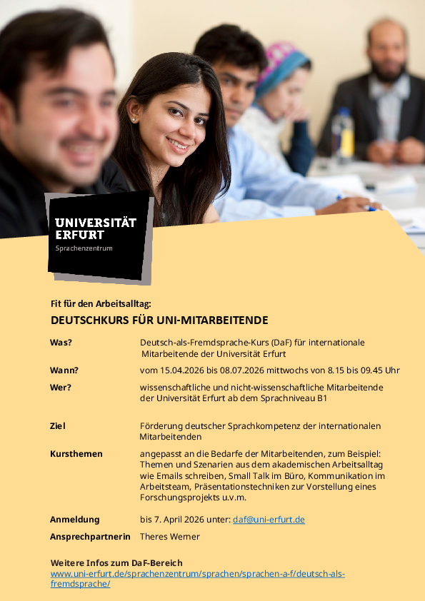 Im Sommersemester 2026 findet wieder ein Deutschkurs für Mitarbeitende ab dem Sprachniveau B1 statt. Weitere Informationen finden Sie im Flyer.