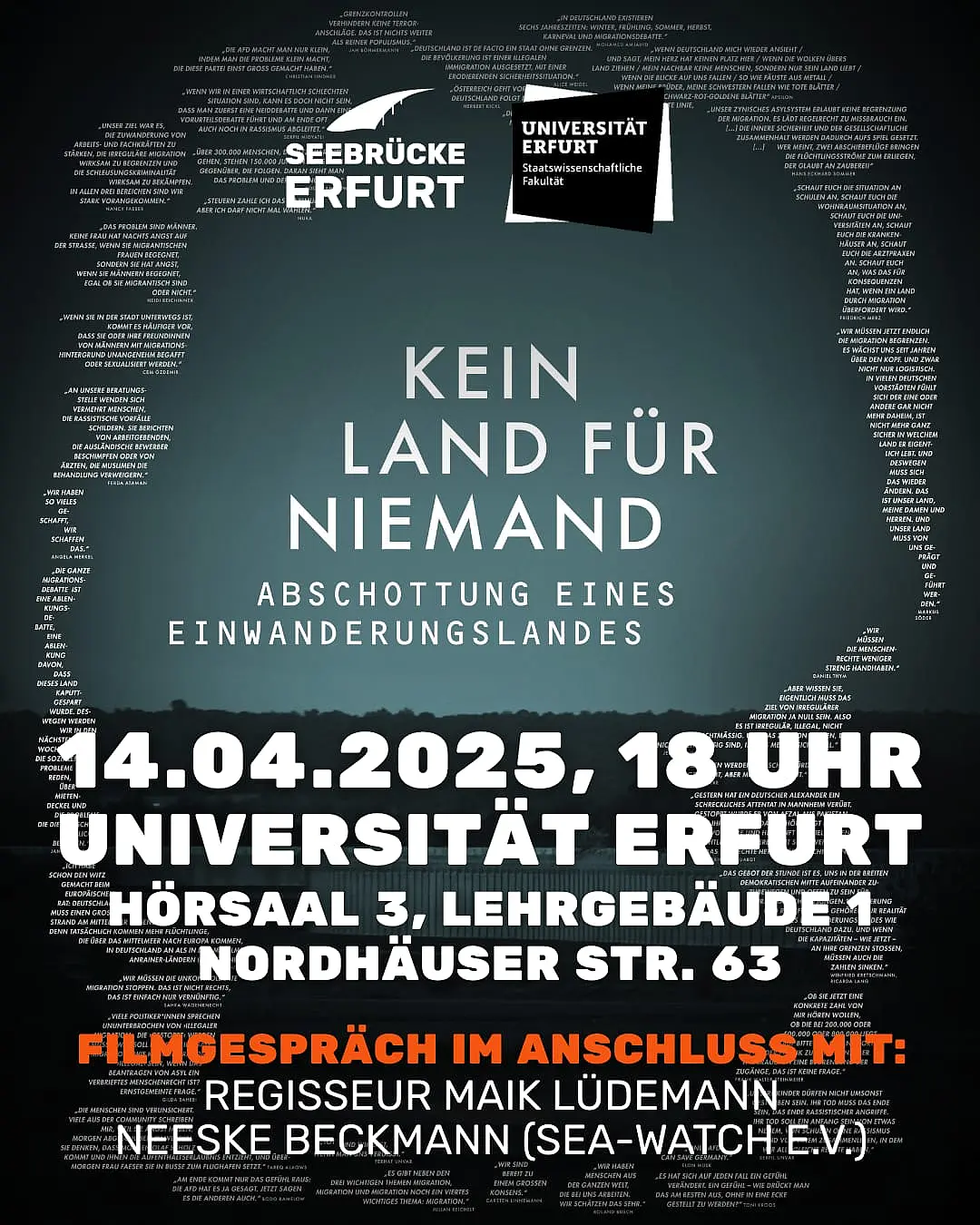 Der Dokumentarfilm „Kein Land für Niemand – Abschottung eines Einwanderungslandes“ zeigt die brutale Realität deutscher und europäischer Abschottungspolitik: Rettungseinsätze im Mittelmeer, Gewalt an den Außengrenzen, Geschichten von Menschen, die trotzdem ihren Weg nach Deutschland geschafft haben – und den Preis, den sie dafür zahlen.