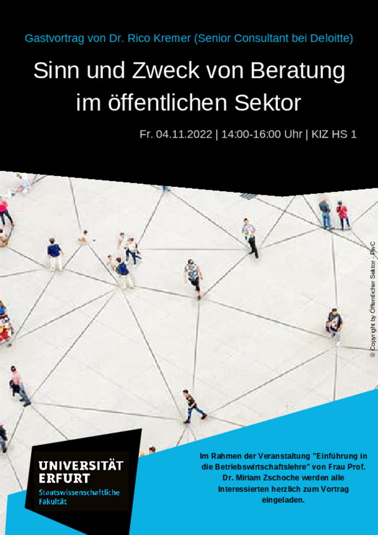 04.11.2022, Gastvortrag im Rahmen der Vorlesungen "BWL I und II", Thema "Sinn und Zweck von Beratung im öffentlichen Sektor", Dr. Rico Kremer (Deloitte)
