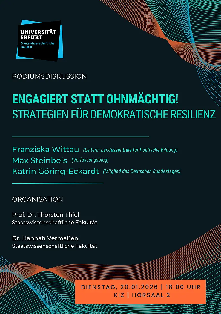 In einer Podiumsdiskussion an der Universität Erfurt eröffnen wir die Möglichkeit, verschiedene Perspektiven und Ideen kennenzulernen, wie wir unsere Demokratie besser aufstellen und schützen können. Wir wollen mit drei Persönlichkeiten ins Gespräch kommen, die die Diskussion um resiliente Demokratie in den letzten Jahren entschieden geprägt haben. Es diskutieren: Katrin Göring-Eckardt, seit 1998 Mitglied im Deutschen Bundestag für die Partei Bündnis 90/Die Grünen - ehemalige Vizepräsidentin des Bundestags und eine der bekanntesten Stimmen für die Demokratie aus Thüringen; Max Steinbeis, Gründer des Verfassungsblogs, Initiator von dessen Thüringen-Projekt und Autor des Buchs “Die verwundbare Demokratie”; sowie Franziska Wittau, die Leiterin der Landeszentrale für Politische Bildung in Thüringen.